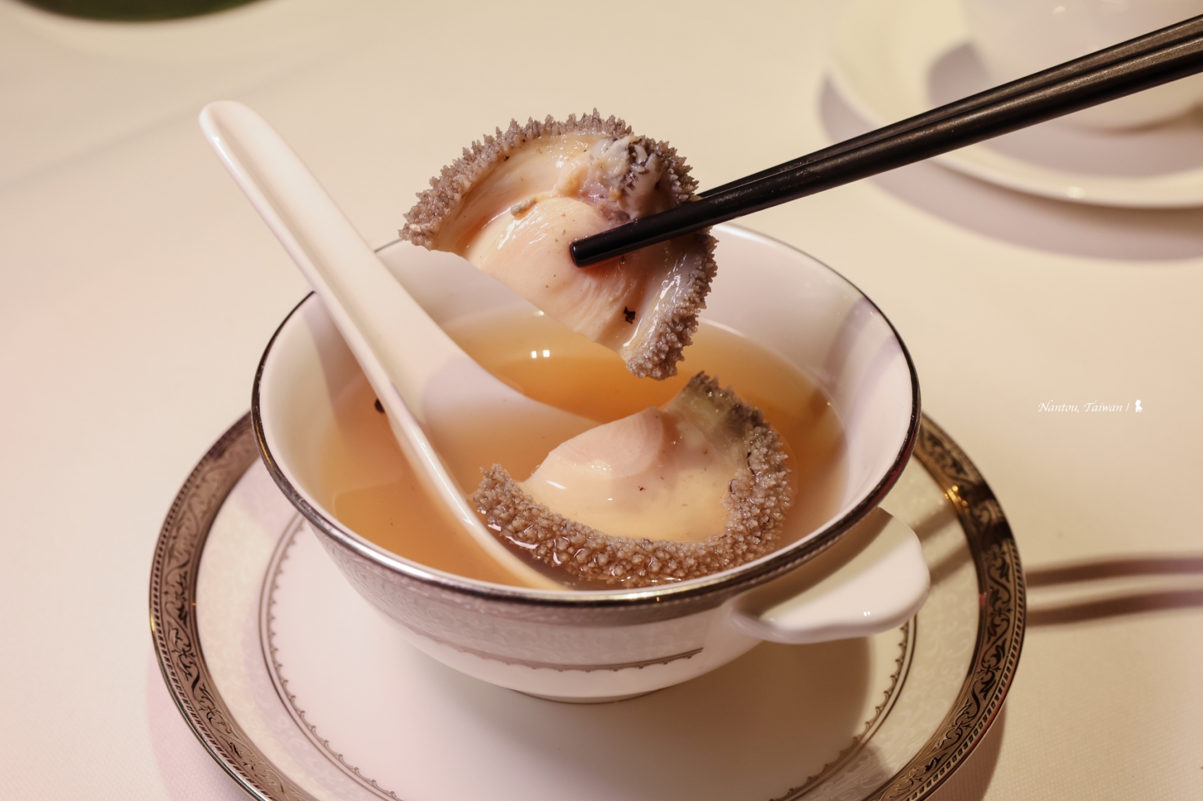 ⇑ 湯品「馬告青橄欖燉鮑魚」令人印象深刻,湯頭清甜、鮮美,融合馬告與檸檬的細膩香氣
