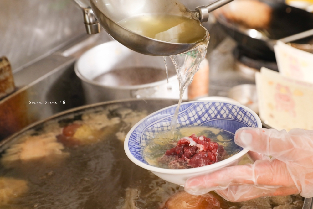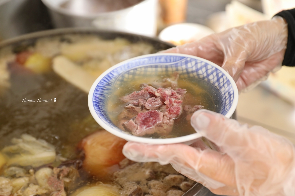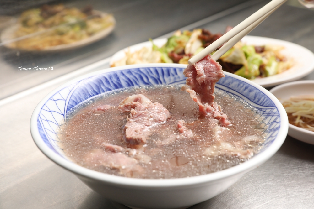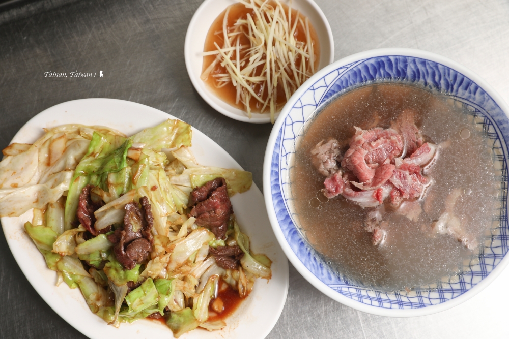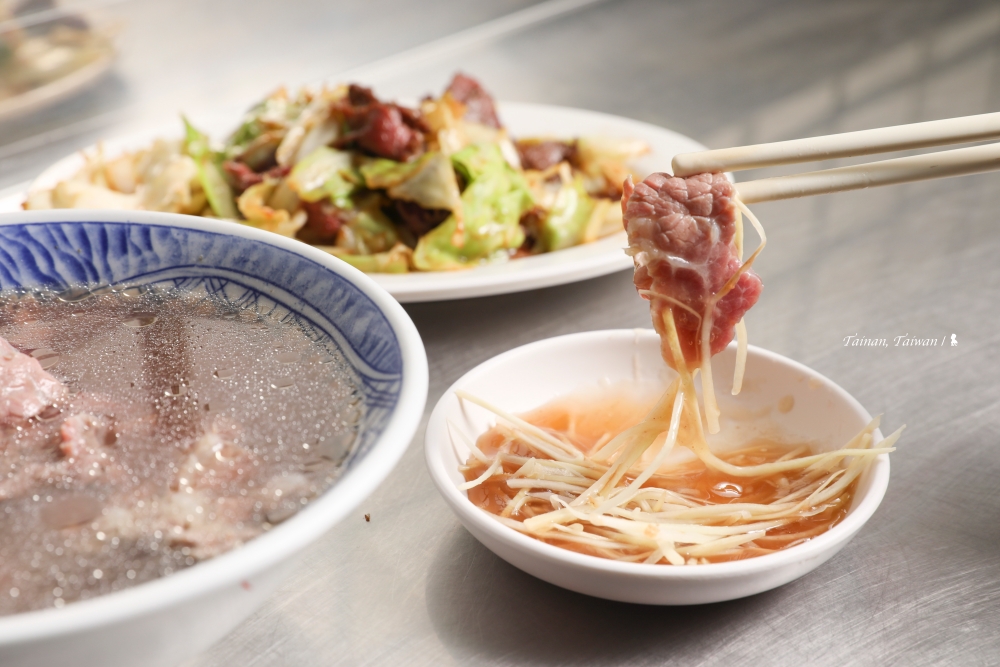 另一道來店必點的牛肉湯,使用的是溫體台灣牛,老闆娘特別提醒,淋完熱湯開始算,十秒鐘內一定要吃,才能嚐到牛肉的鮮甜!另外附的小碟子裡頭,裝的是甜油膏、薑絲與一點辣豆瓣醬做提味,夾塊牛肉一沾放入口,鹹香帶甜,嗯…這是台南的味道沒錯!一碗白飯配高麗菜炒牛肉與牛肉湯,簡簡單單的一餐,卻讓我感到好幸福。