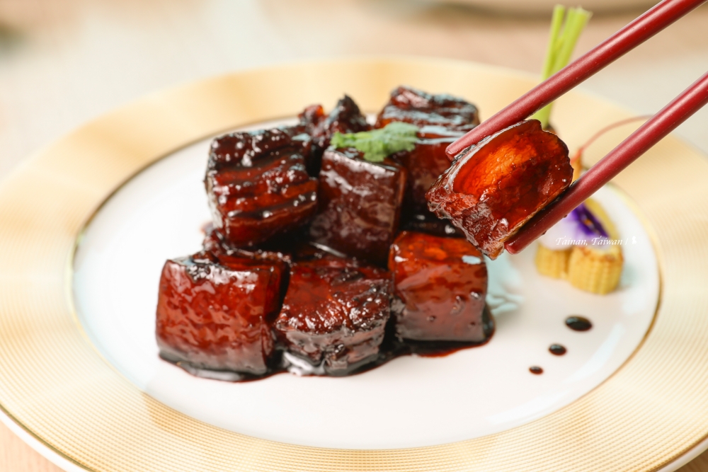 率先上桌的頭盤這五道,可謂名符其實的貌美如花,包括鎮江水晶肉、金藕裹珍寶、陳醋冰卷、冰梅西紅柿、芹花海蜇頭,盤飾確實提升至藝術層次,美的讓人捨不得動筷,其中我最喜歡冰梅西紅柿,很開胃!接著「上海紅燒肉」是讓我難忘的一道濃油赤醬功夫料理,特選黑毛豬五花肉,以醬油、白糖及香料與豬肉下鍋煸透入味,再加入蔥段、薑片炒香,增添鍋氣,軟嫩爽口肥膩適中。這是一道需要精準掌握時間與火候的料理,經驗很重要,「一位師傅需要掌勺幾年才能把這道菜做好?」陳副主廚回答我至少要十年!聞畢,我把握機會再多夾一塊送入口中。