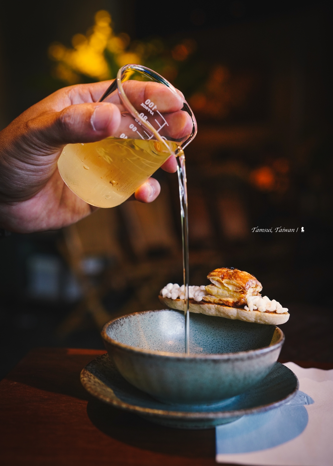 “茶碗裡琥珀色的茶湯盪漾著金色桂花,在品飲時散發桂香和茉莉的優雅,入口茶香芬芳;這是『之間』最新的餐前飲品和小食。碗緣擱了一艘舢舨船,船上載滿了稻米,這曾是淡水河面上的千帆風光。酥脆的船身裡我們填抹了以糙米醬鋪底的特製內餡。”