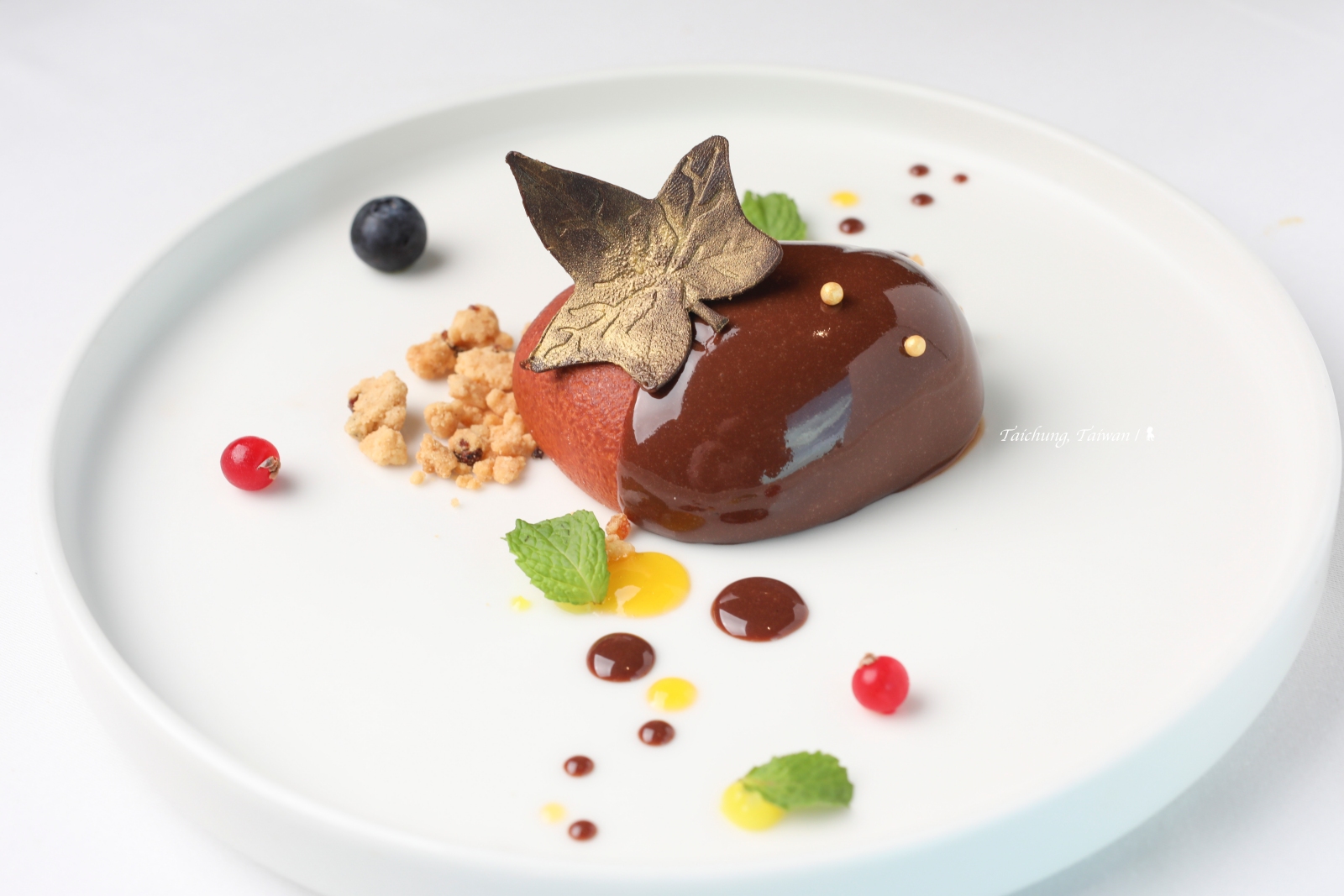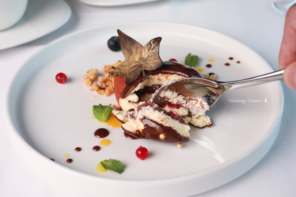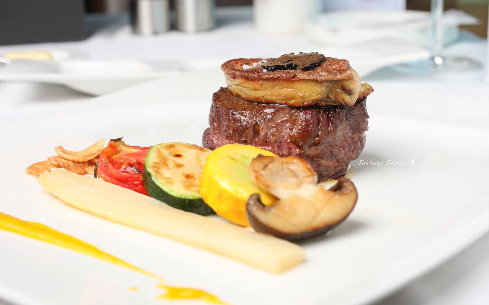 肉質相當頂級,據說是全台中唯一使用 Elite Prime Beef 的餐廳。主廚使用經典羅西尼菲力牛排作法,上頭放了鴨肝與松露,牛排採低溫慢烤維持軟嫩再行炙燒。何主廚分享「品嚐牛排有四大要訣:軟嫩、汁性、風味、香氣」,經過提點、我吃得更入味了。