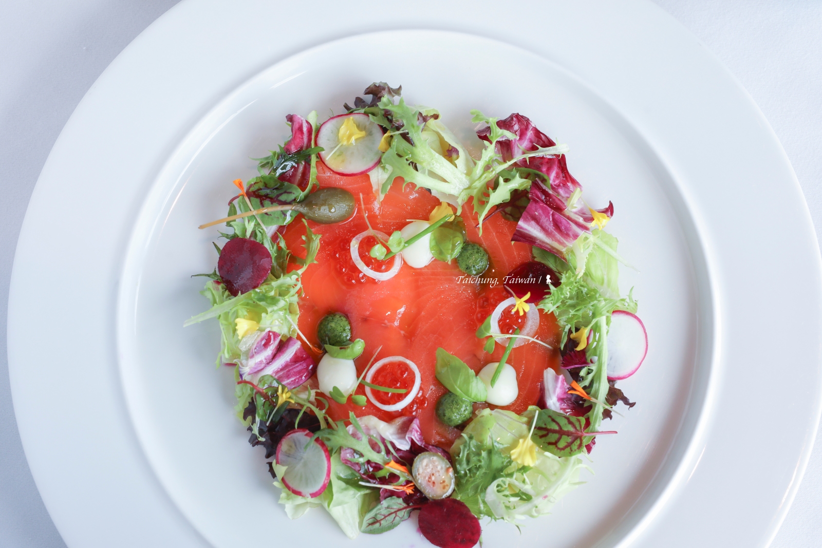 使用市場兩倍價來自紐西蘭的國王鮭魚,肉質鮮嫩細緻,搭配具有酸豆口感的花椰菜花苞醃漬、青醬 Cream cheese、漬甜菜,滋養了味蕾與視覺,美得猶如一座花園!