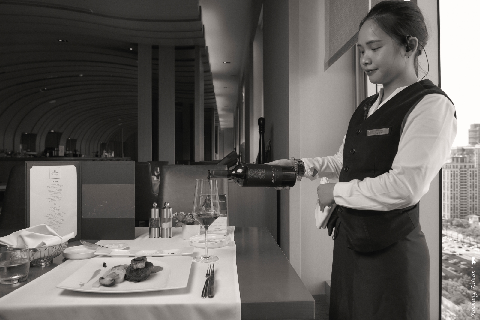 若想讓氣氛更微醺些,餐廳裡有個蒐藏上百款酒的酒窖,不妨請服務人員推薦好酒佐餐,他們很專業,得知我酒量不好、甚少飲酒後,挑選一支 2016 年來自加州的紅酒讓我試,表示這支偏甜、酒味沒那麼重,剛好讓我來搭配即將享用的美國菁英級菲力牛排。