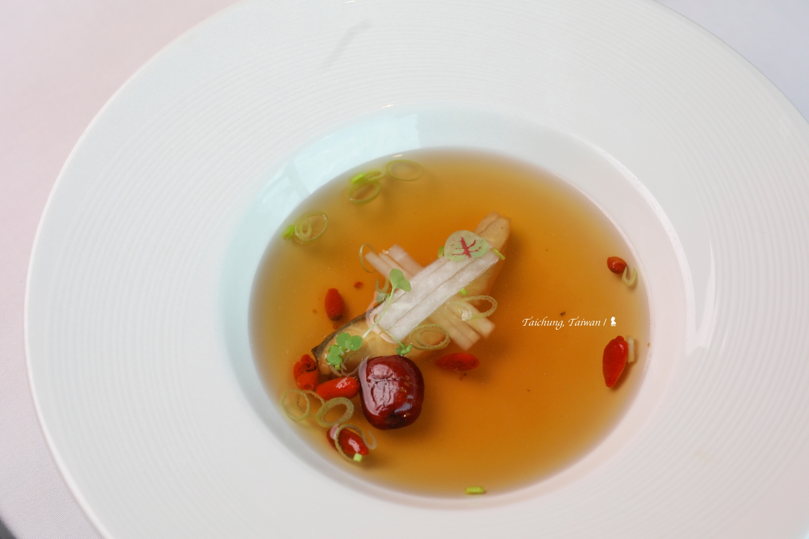 看似尋常卻是一道工夫菜,從頭到尾得花上兩天製作。湯底是使用老母雞搭配蔬菜熬煮,利用法式料理手法,用蛋白做澄清,這是湯如此清澈的秘訣!再加上紅棗、枸杞等中藥材增加甜味,上頭再放上白色結頭菜增添口感,重點是主角鱘龍魚是主廚從谷關尋得,品質甚好。