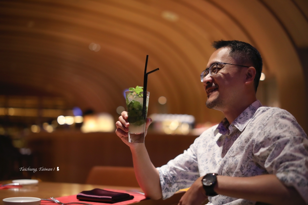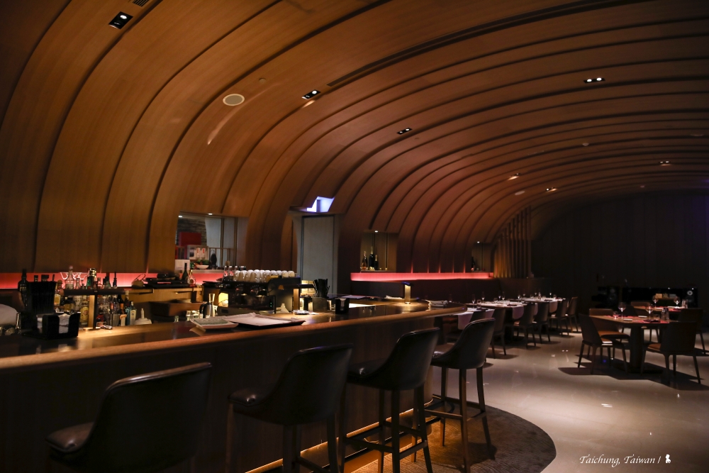 餐廳挑高的空間設計很具特色,木頭天花板呈現的優美弧度,彷彿一道準備傾瀉而下的巨浪,在這用餐的客人就被這凝結的暖色調管浪包護著,讓人印象深刻。其實前一晚,我就上來這點了杯無酒精的 Mojito 一邊欣賞被譽為台中曼哈頓的夜景,我尤其喜歡夜裡的照明設計,透過明暗對比,讓這從地板延伸到天花板的線條,柔軟卻又充滿力量。據說靠窗的那幾張桌子都是受歡迎的求婚桌,美饌加上令人迷醉的夜景,那氛圍太美怎捨得吐出一個不字呢?