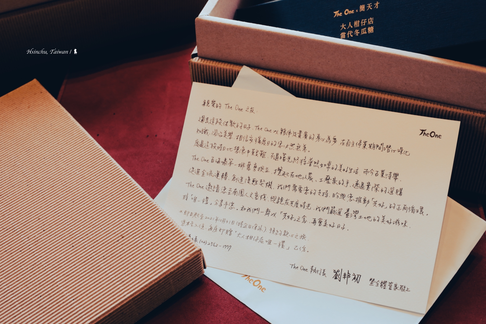 中秋前夕,家裡信箱躺了一封 The One 執行長寄給 The One 之友的問候卡,他們沒單只想到因疫情休園長達兩個半月的自己,字裡行間不見悲情,更教我感動是還自立並強牽起這塊土地上的夥伴們持續追求共好!他們準備了一份「唯一禮」要給南園的老朋友,包含了客家桐花茶杯、十年老蘿蔔乾、酒香冬橘果醬等加總價值超過三千元的好物,可說極具誠意,凡於 2021 年底前預約所推出的「歇心之旅」方案,憑該卡入住即可領取精心準備的再會禮。多有風骨又見風雅的行銷方式,重磅數的卡片傳來溫度,也喚起去年秋天造訪新竹南園的美好回憶…