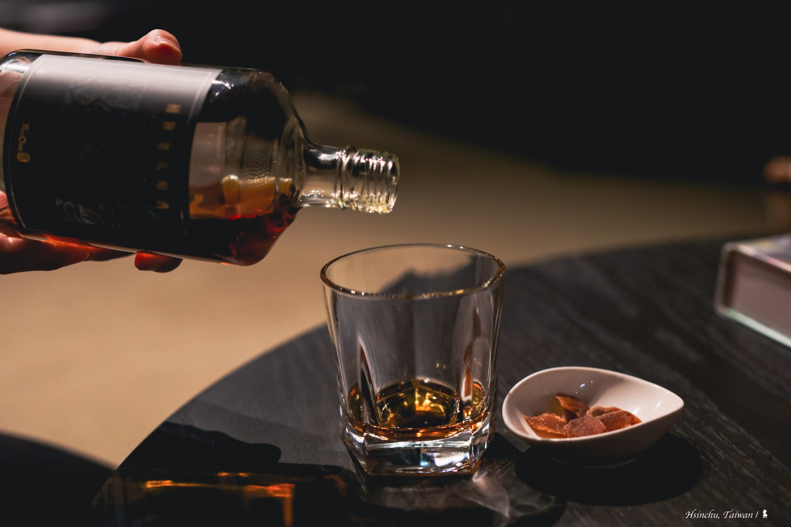 夜晚在富貴齋舉行的「黑膠賞聆」,是我去年造訪南園很喜歡的一段時光,當時第一首我在這聽到的歌曲,彷彿成了後來會想起的印記,那是鄧麗君的「莫忘今宵」。這回再訪,驚喜是緊接在「風檐夜遊」後的這段體驗,又升級了!取名「黑膠音樂微醺時光」。顧名思義,在曲目播放的中場,增加了管家推出酒車的橋段,這夜他們分別準備了兩款酒,都很具巧思,風味也佳。首先是 43% 用地瓜釀的威士忌,搭配的不是起司,而是很在地風味的老菜脯,乍聽不合理,但親自體驗後會發現竟意外的搭!第二款的酒精濃度低些,是 8.5% 的紅烏龍梅酒,使用的是台東的紅烏龍茶,甜美輕盈,很好入口。在酒精的催化下,微醺,讓音樂更動聽了。