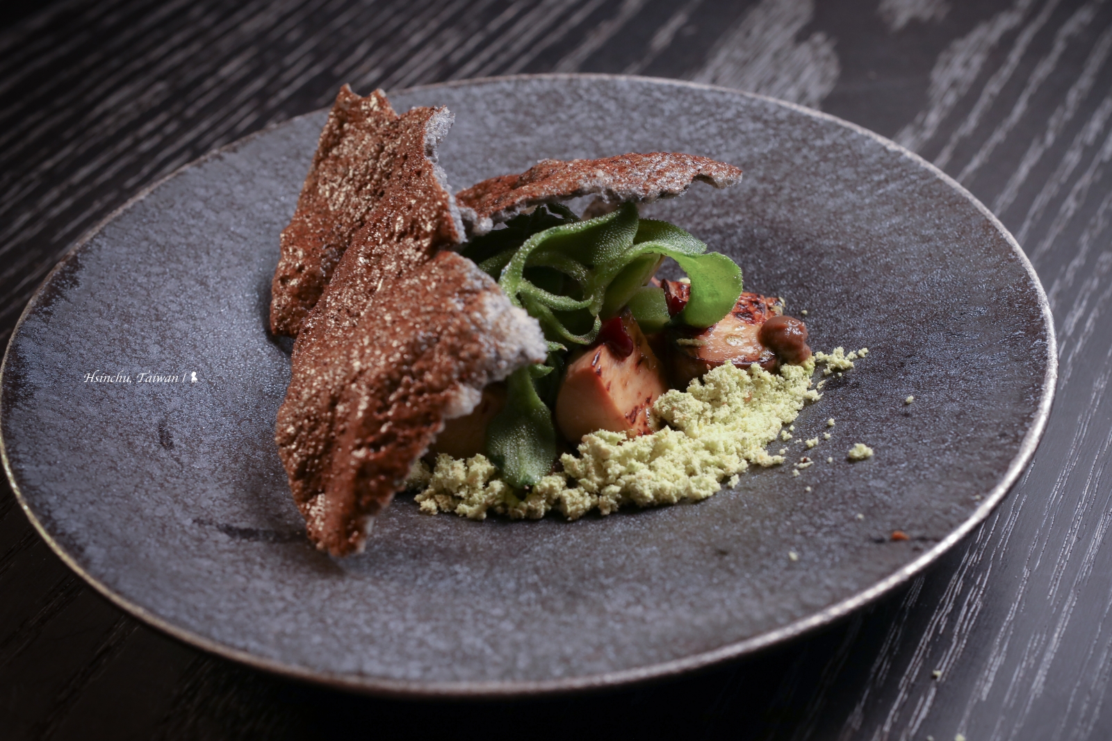 晚餐安排在昔日款待柴契爾夫人、戈巴契夫等國家元首的的國宴廳,這套「釀與漬」菜單展現了風土滋味的懷舊與新意,用餐過程再搭配「一道料理、一曲古箏」的表現方式,舌尖嚐到驚喜,耳朵也聽得滋潤。富創意的使用法餐手法表現在地特色,我尤其喜歡其中兩道,展現森林秋冬景象的「野菇森林沙拉」,這端上的第一道就讓人鼓掌叫好!具巧思的以山當歸製成土壤,覆蓋在上的是用蘑菇與米慢熬製成的炸米餅,那皺摺的質地是樹皮意象。掀開後,暗藏的冰花與石蓮花,則展現了森林裡的旺盛生命力,兼具創意、意境與美味,精彩!主菜「酸柑茶立鱗馬頭魚」,要表現的是柑橘香氣與海鮮的搭配,這道料理最特別的是使用日本立鱗燒手法,將馬頭魚的魚鱗燒得都「站起來」,層疊彷彿蜂巢,魚鱗的酥香脆跟細緻魚肉口感產生強烈對比,有趣,也好吃。
