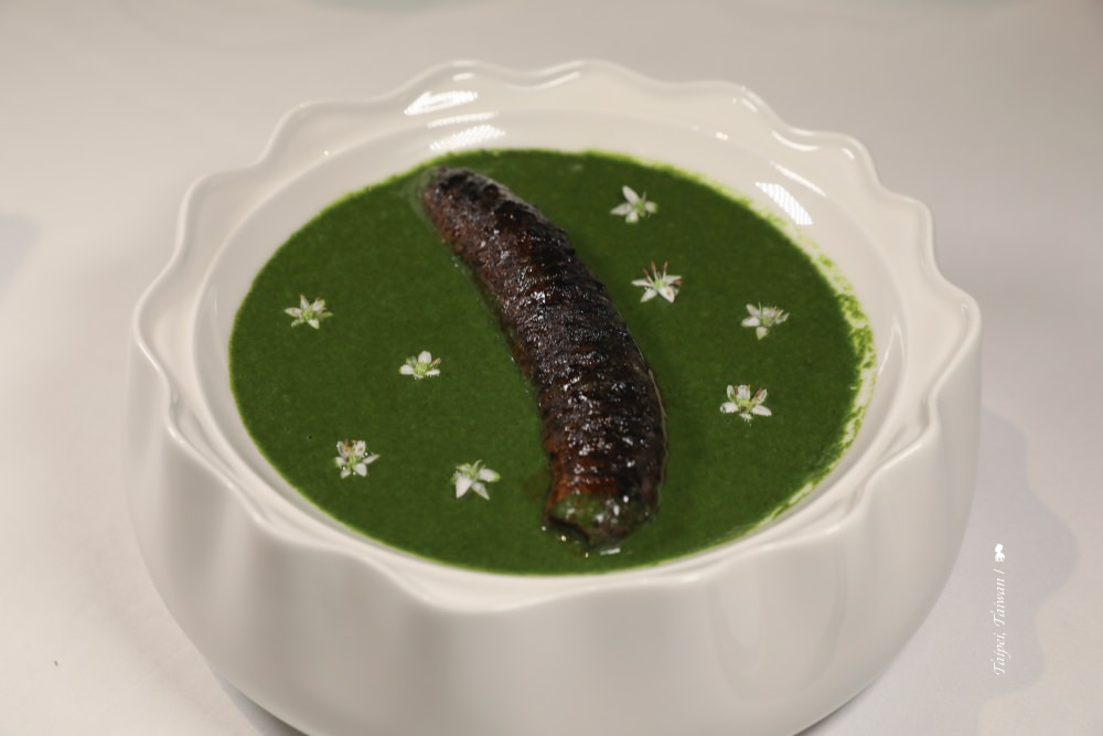 ⇑ 翡翠蔥㸆烏參,蔥醬汁的翡翠色澤是西湖水,韭菜花蕊則是湖中之島,意象美感十足!