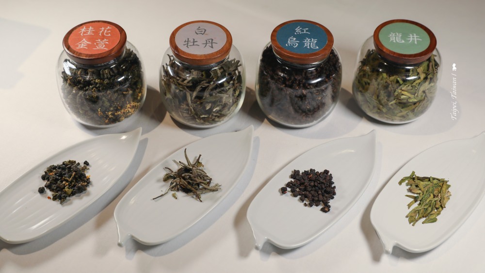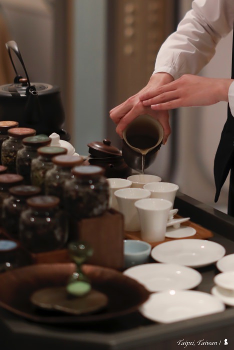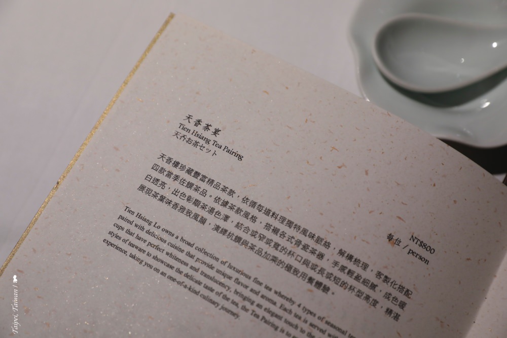 這是每人 NT$ 800 元的 Tea Pairing 「天香茶宴」,侍茶師會在客人點完餐後,依據餐點的風味脈絡,客製化準備四款佐饌茶品,並視不同茶的特性搭配各式骨瓷茶具。搭配與順序是門學問,侍茶師說通常淡茶會配口味較淡的料理,反之。所謂茶的濃淡,最簡單來說為視茶葉的發酵程度,這晚的白牡丹(白茶)與龍井綠茶最淡,來自台東的紅烏龍最濃郁。而打頭陣的桂花金萱,圖的是用其芬芳來作開場,很具巧思!