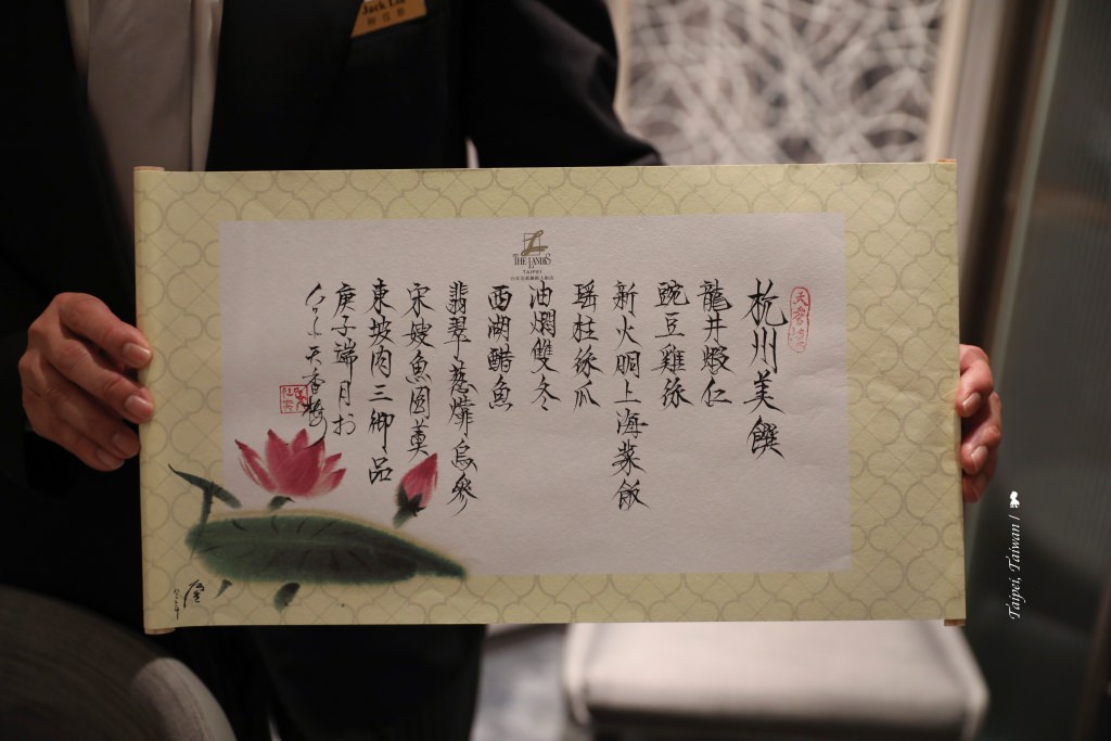 沒能親眼見到董老師現場揮毫,沒關係,餐廳另請了一位字體絹秀的書法老師,會把每桌客人點的菜色一筆一劃寫成菜譜送作留念。我一邊欣賞老師行雲流水的勾豎橫撇,也留意到一旁的茶車,侍茶師正優雅地為我們沖泡今晚要配餐的第一款茶:桂花金萱。