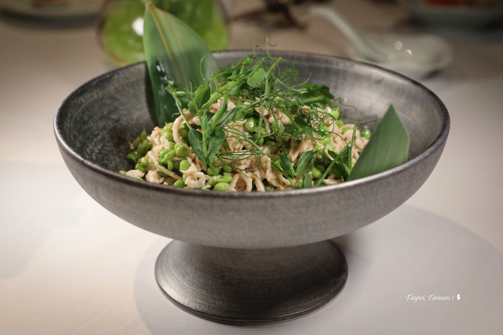 ⇑ 碗豆雞絲,光要把甜豆仁用手工去殼就很費工!這道用鮮嫩雞絲爆炒的菜餚,鮮嫩翠綠的顏色讓人食指大動外,選用器皿也深具質感