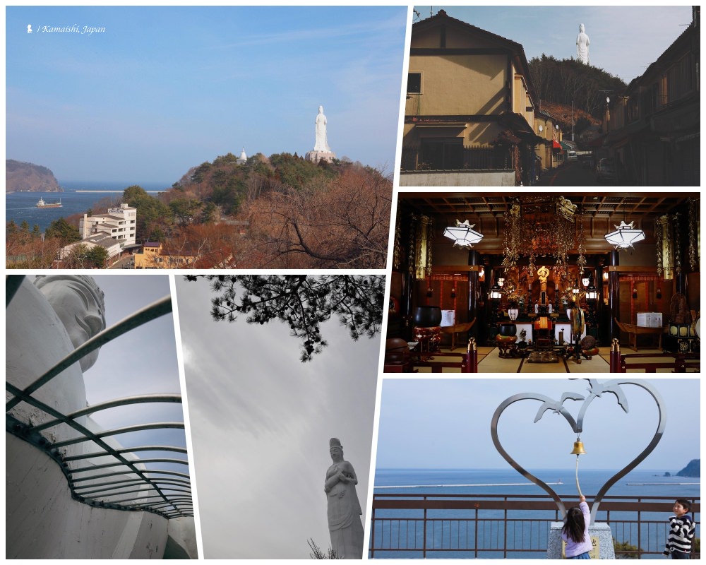 從盛岡搭電車約2.5小時,來到釜石來拜見白觀音。釜石大觀音高 48.5公尺,內部共有13樓,外觀是手上抱尾魚的魚籃觀音造型。經過拜殿、可沿著螺旋梯巡遊七福神的 4 到 7 樓而上,最後來到展望台,正好位於觀音菩薩懷抱的魚身上。從海拔120公尺高的展望台望出去,太平洋美景盡收眼底。