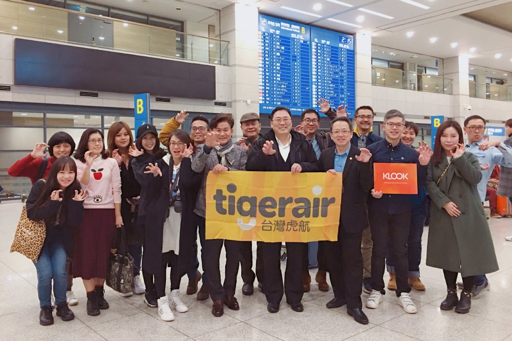 ⇑ 台灣虎航董事長張鴻鐘(左3)率領團隊一起搭首航班機,前往首爾在當地舉辦開航記者會