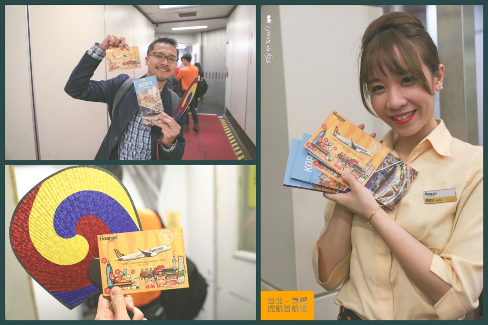 很幸運身為這條航線的首批乘客,與台灣虎航張鴻鐘董事長一塊搭上首航班機飛往首爾!這是我第一次搭首航班機,知道航空公司慶祝首航都會有些準備,因此除了原本出遊的期待外,還多了參與歷史時刻的興奮感!1月3日起飛這晚,除了登機口與機上廣播會特別提到首航,搭機前還準備特製大型相框與舉牌讓乘客打卡拍照留念,此外台灣虎航也準備印上首航日期的韓風明信片及韓國觀光公社提供的圓扇、首爾觀光手冊送給第一班乘客,禮物沒多貴重、重點是共同感受那股慶祝歡欣!