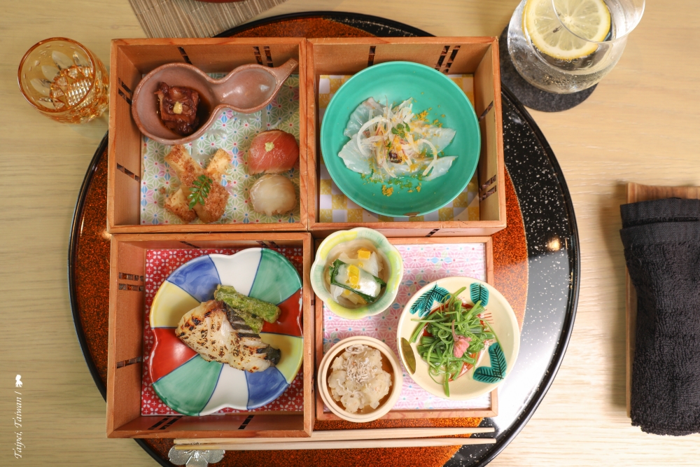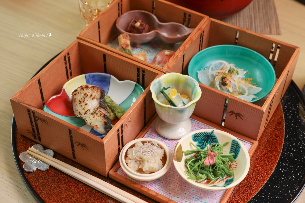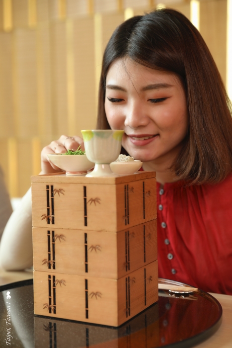 這層層疊疊的是日本御節料理,象徵把幸福堆疊起來祝福客人。接著,服務人員會一一打開,像是多寶閣,讓人一陣驚嘆!