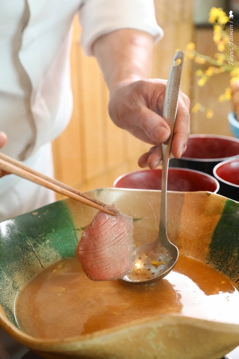 這道副料理長從切菜開始,都在桌邊進行,彷彿現場觀看一場廚藝秀。牛舌使用的是澳洲牛,不過我本就對牛舌沒偏愛,加上可能為求口感而切得較厚,這嚼舌根,我自己沒那麼喜歡。
