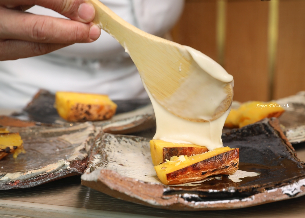 副料理長在桌邊將烤得熱燙的地瓜切塊,使用的地瓜是台農 57。接著像場表演,將白胡麻醬加入檸檬、牛奶、鹽巴以及葛粉、快速打入空氣,形成濕狀又充滿奶香的綿密醬料,舀一匙淋在地瓜上,黏稠的像是麻糬。副料理長說,這道料理要先聞其胡麻奶香,一嗅、哪忍得住,馬上一匙送入嘴巴,口感真是好!
