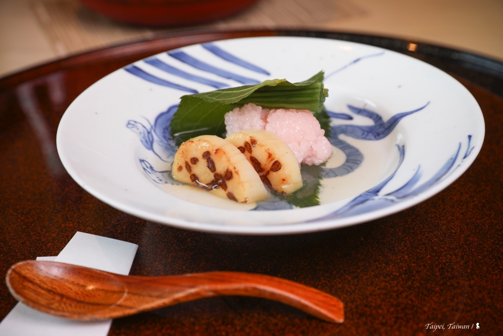 食材、器皿與現場料理過程交織撞擊, 一如春天的百花爭妍,讓我大呼過癮!整餐吃下來,相當精彩,從前菜「櫻餅 烤帆立貝 野菜」開始,各種蔬菜、海鮮、牛舌、炊飯以及甜點依序上桌,口味變化多但份量控制的剛好。坐我對面的營養師職業病上身、餐畢馬上統計這餐熱量是 1315 大卡(不含酒),還表示只要注意幾點,就算是減重者,也能盡情享用這一餐!
