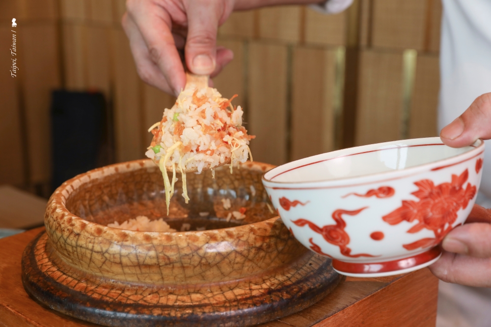 這土鍋炊飯使用的是東港櫻花蝦,搭配的是紅味增湯,值得一提的是,用來盛飯的橘紅釉色碗,跟櫻花蝦的顏色相映成趣,為視覺加分!
