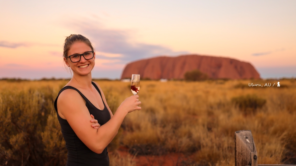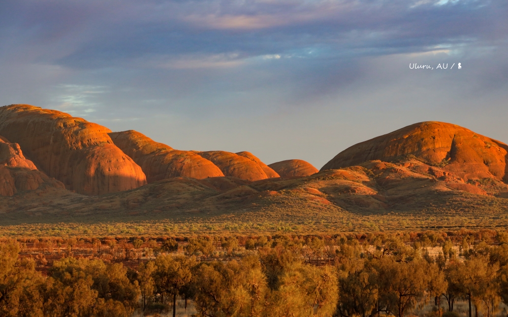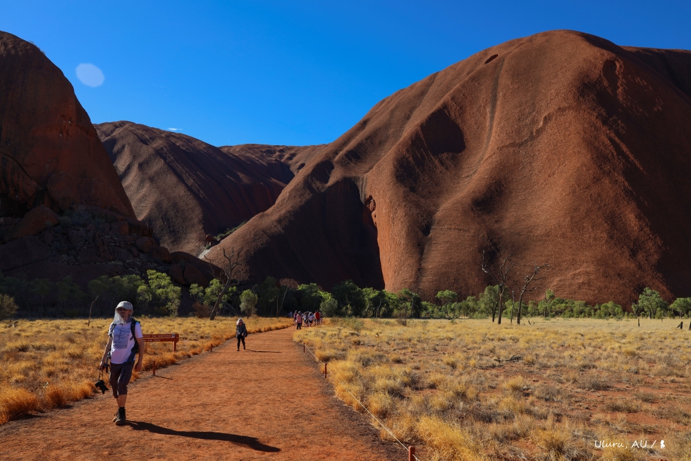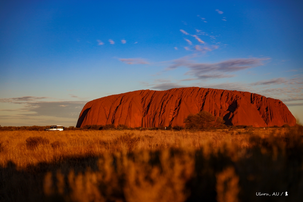 隨著光線,烏魯魯與時俱變,不能錯過景色截然不同的日出與日落。在卡塔丘塔日出觀賞區(Kata Tjuta Dune Viewing Area)能欣賞到地平線上的完全日出。太陽會從烏魯魯左側升起,巨岩就像塊掉在地上的餅,從破曉前的黑色剪影逐漸被抹上一層金黃,每天經旭日烤過後新鮮出爐,這時手邊有杯咖啡搭配享用,再幸福不過。儘管眼前風景頃刻萬千,也不要忽略左後方像多個饅頭組成的卡塔丘塔也正被染成玫瑰色,呈現史詩般壯闊。相較於日出,烏魯魯的日落步調較慢也浪漫,參加當地的日落行程,老司機會帶來到最佳欣賞位置,同時準備了一桌的可口小食,並提供香檳讓你舉杯向彷彿正微醺臉紅的烏魯魯道晚安。