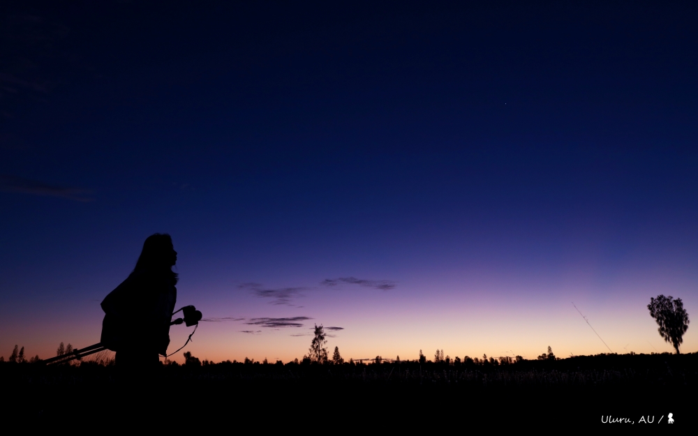 拍攝 tips:拍攝烏魯魯原野星光展,最理想是上腳架進行長時間曝光,但若跟我一樣剛好腳架不在手邊,那只能調高 ISO 值,好在目前新款數位單眼在高 ISO 情況下都能有效抑制噪點,像這次拍攝用的 Canon EOS R,使用 ISO 12800 搭配手持下的安全快門,成功將地上燈光與天上星光一起拍攝。此外,可把握破曉前拍攝人與樹的剪影,會很有意境