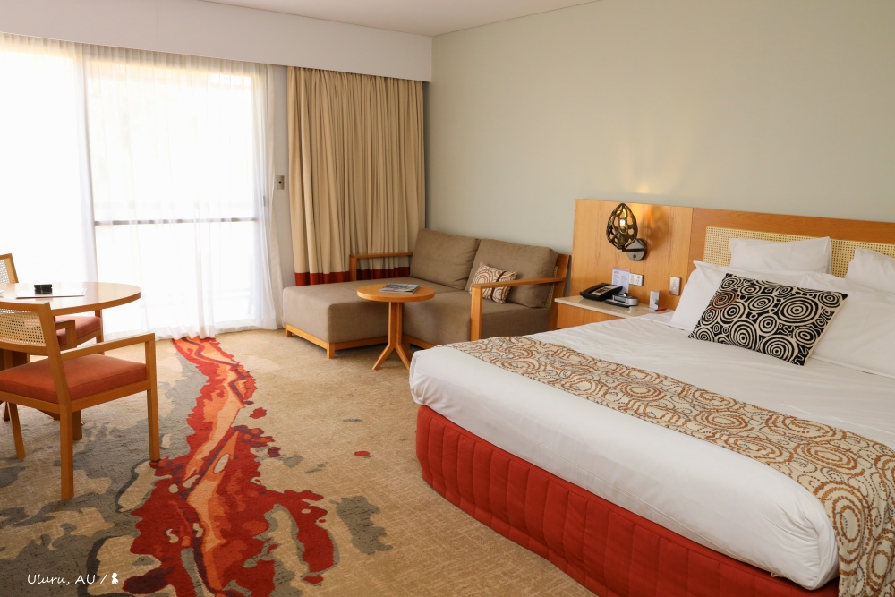 艾爾斯岩度假村是紅土中心唯一的酒店集團,從青年旅館到五星級度假酒店共有五間可供選擇。這次是入住當中最頂級的沙漠風帆酒店(Sails In The Desert Hotel),從房間到公共空間大量使用原住民的點畫元素,甚至還有個藝廊展示與販售當地藝術家的作品。提到藝術推廣,酒店正與英國一位藝術家 Bruce Munro 合作,推出「烏魯魯原野星光展」(Field of Light Uluru),選在烏魯魯附近一處廣達七座足球場大的曠野,使用五萬多個覆蓋著磨砂玻璃球體的太陽能燈管所創作的光海鉅作,黑暗中讓人彷彿走入星光熠熠的夢境,或彷彿是從飛機上俯瞰繁華的城市燈火,是個前所未有的視覺體驗,寧靜卻震撼,該展將進行到 2020 年 12 月 31日。