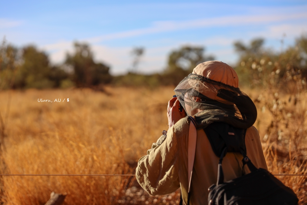 烏魯魯位於澳洲內陸的紅土中心,從台灣出發可直飛雪梨,再搭乘國內飛機約三小時抵達烏魯魯。我在四月上旬造訪,南半球的澳洲時序入秋,相較雪梨十多度的涼爽,降落烏魯魯彷彿又到另一國度,超過卅度的高溫乾燥迎面而來,原來這裡接近赤道,沒有冬夏、只分雨季與旱季,四月到十月是氣候較穩定的旱季,是最佳旅遊季節。除了熱情天氣,另一項歡迎儀式是蒼蠅大軍的爭相獻吻,雖不像蚊子會咬人,但幾十隻蒼蠅揮之不去也是煩人,教人不敢輕易開口,我笑說若在這住上一年,說不定就能練成腹語術。不過當地有賣一好物:防蠅頭紗,像個小型蚊帳往頭上一戴,一秒把蒼蠅阻隔在外。跟吸血鬼相反,好消息是這的蒼蠅是日落而息,入夜後就沒此干擾。