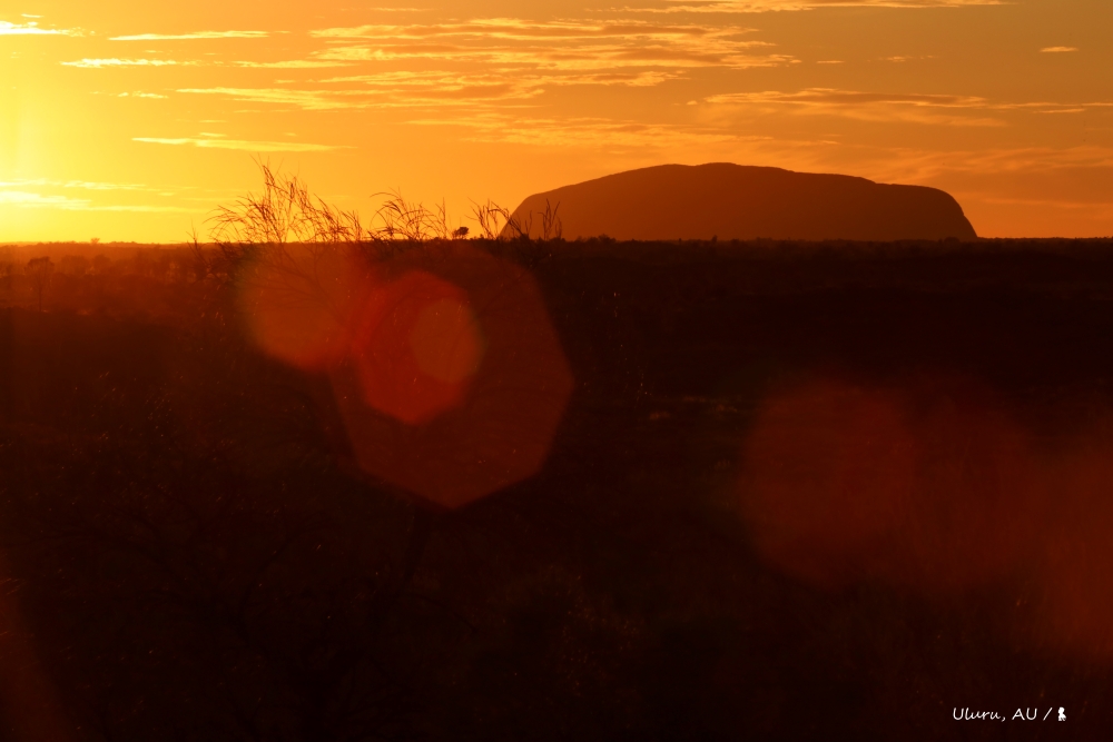 拍攝 tips:日出前天空魔幻般的漸層顏色與雲霞多彩是拍攝重點,此時就讓烏魯魯暫時屈居配角,以剪影來襯托雲彩。太陽從地平線冒出的日出時刻,避免過曝,建議將相機曝光鎖定在畫面最亮部位