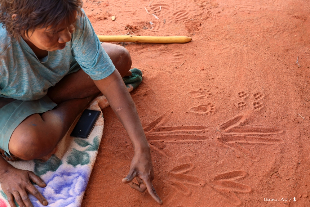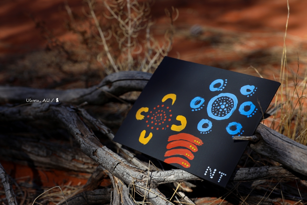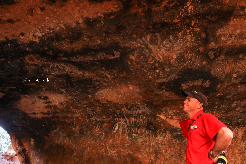 當地原住民阿南古人將烏魯魯視為聖地,一萬年前便已在此居住,洞穴裡留下原住民使用赭石、木炭所繪製的壁畫,歷史也有千年,留有壁畫的洞穴不少,可任選一條步道慢慢逛,或若時間有限,推薦一處扮演學堂功能的「教育洞穴」(Teaching Cave),在那累積了世代傳承下來的族人生活智慧,在過去,長輩會把小孩子帶來這藉由壁畫教導他們如何找水源、覓食與使用武器等各項謀生技能。而那些壁畫中的同心圓、箭頭與蜿蜒曲線所代表的意義,就留到去烏魯魯附近「探索文化中心」的點畫工作坊解謎,在一個半小時的課程裡,阿南古族人在地上用沙畫教導多種象形符碼,接著我們拿起畫筆,塗抹與點畫並用以這些古代符號創作,我在右上角畫了六小圈包圍一個圓表示星星,再於左下角畫了四個馬蹄形包圍一組同心圓代表一群人席地而坐,這繪製的是前一晚我與多國朋友們在銀河下的難忘晚餐。