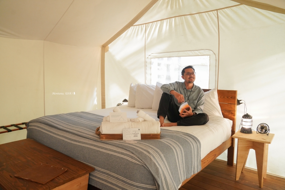 這是我目前體驗過最奢華但也是最自然的旅宿,多自然?光說一點就夠!「帳篷裡沒插座」當我知道後,是真有些張口傻了一下,若是擔心照明,那是小事,床兩旁的邊桌上放著由行動電源供電的露營燈,其實我還蠻享受夜裡低照明的野營感,加上啪啪柴火的微弱火光,那真是蠻有味道。但讓我比較焦慮的是相機、手機等設備電力見底無法充電的困擾,因此若之後有計畫入住,電力這部分建議先準備以免措手不及。