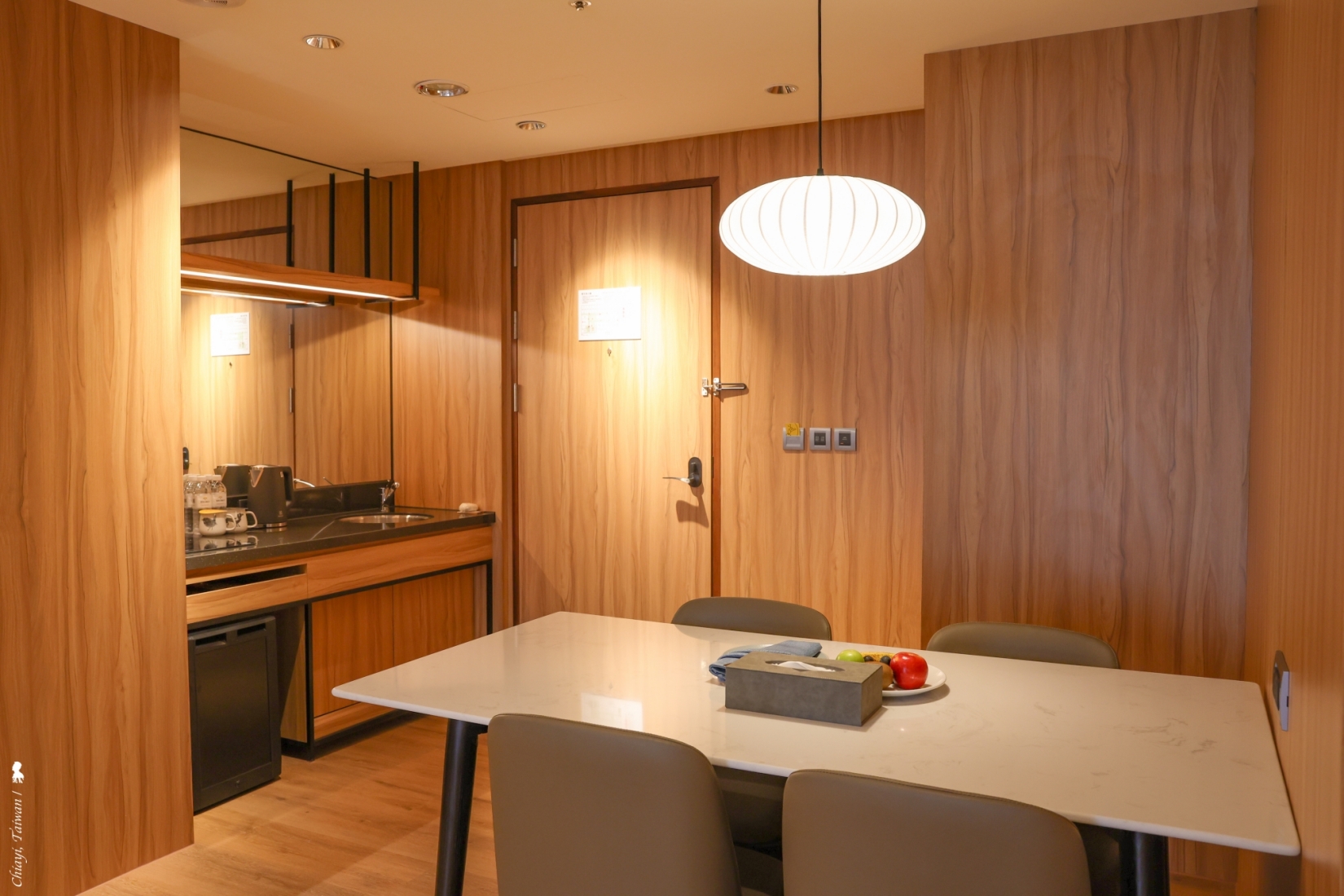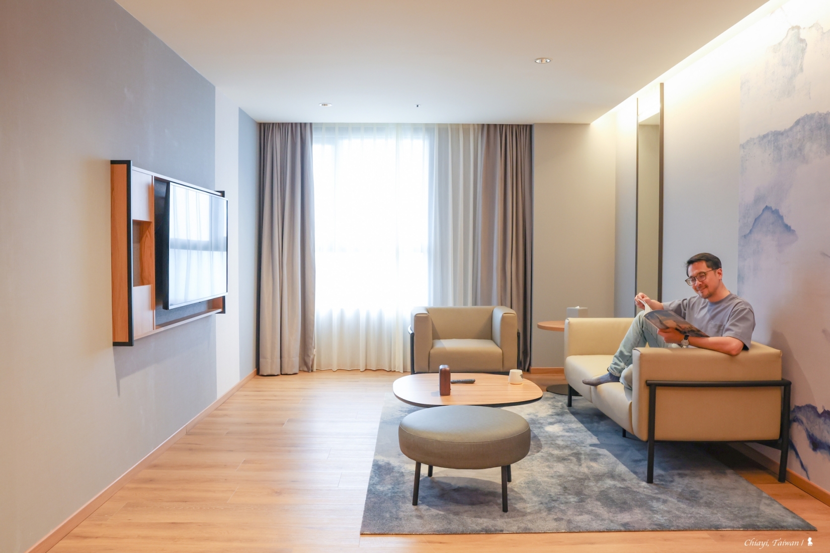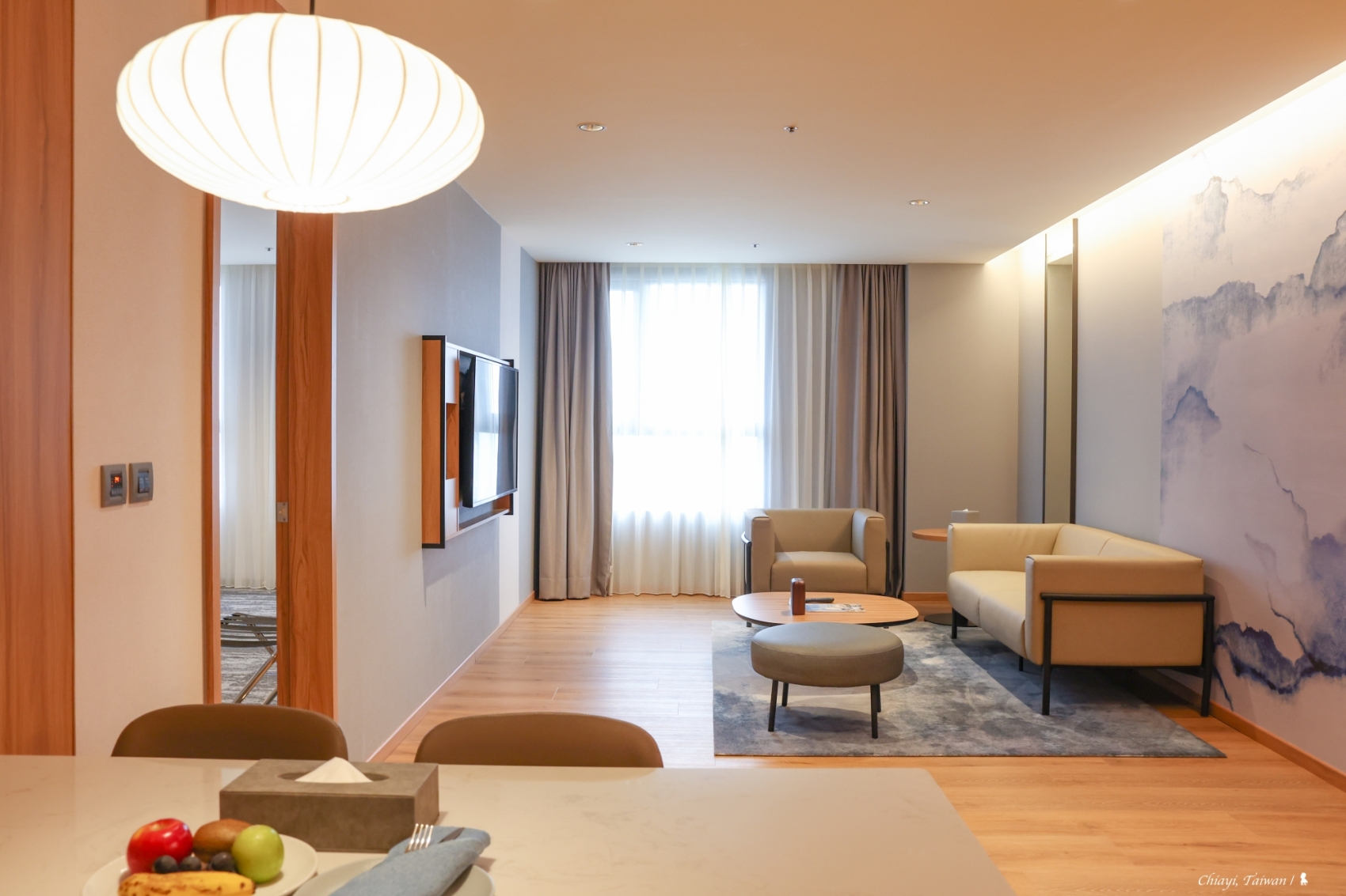 這回原本訂的是高級客房,在抵達飯店前從 app 上查看到因 IHG 白金卡會員身份幸運被升等成單臥套房,這讓我非常興奮期待,畢竟週末一晚這間房約在台幣 1 萬 8 左右,相當感恩。房間被安排在28F 的高樓層,不過嘉義福容 voco 酒店的客房都是規劃在 16-32 樓,加上是當地最高建築,因此房間看出去的視野都會相當開闊。單臥套房的空間很寬敞,有 20 坪大,大致區分為用餐區與客廳以及可帶上門、保有隱私的臥室區,浴室蠻大、帶有浴缸及乾濕分離的沐浴區,稍微可惜是沒有景觀。