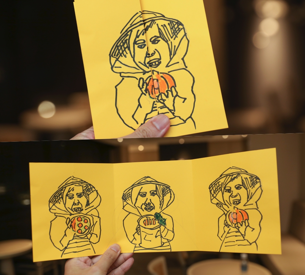 ⇑ 以抱著南瓜的屯山阿嬤為主題進行折疊卡創作