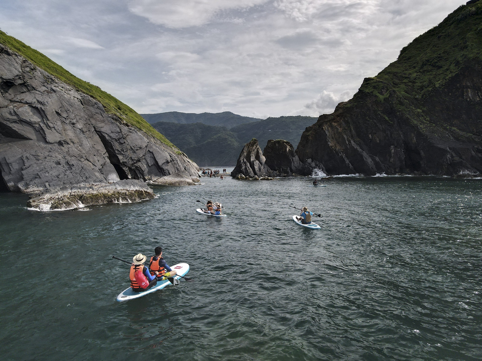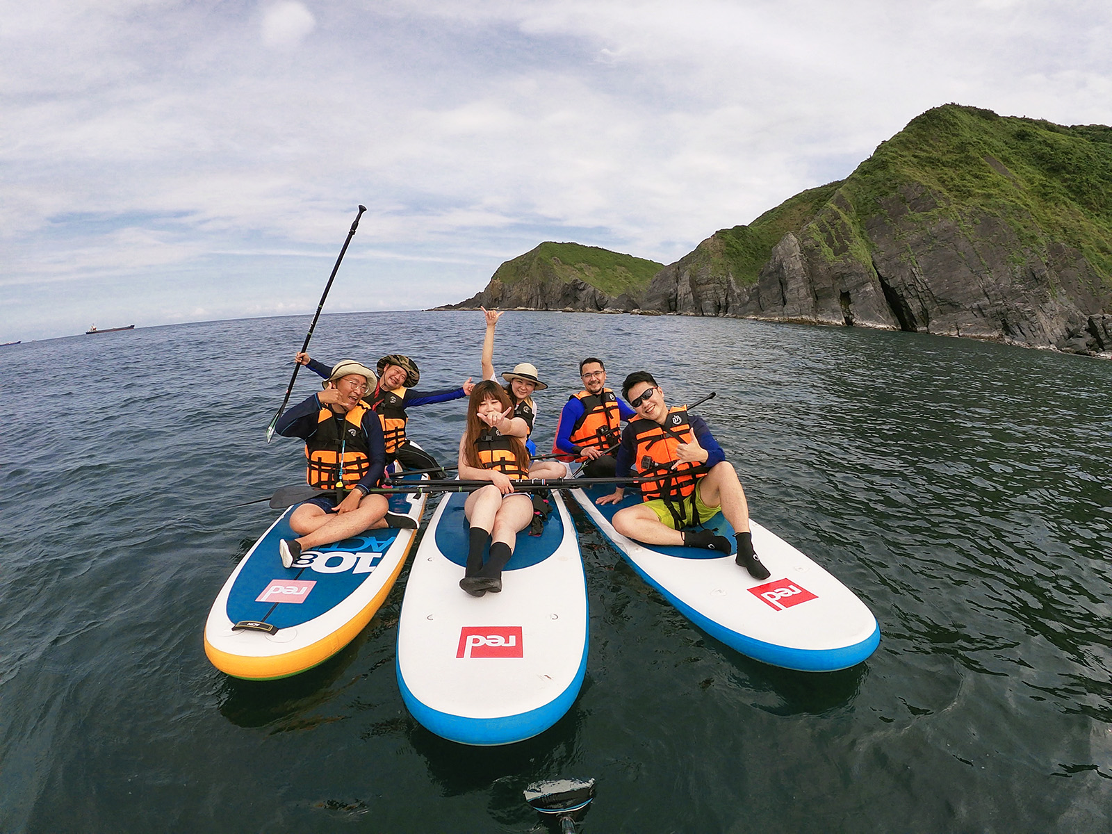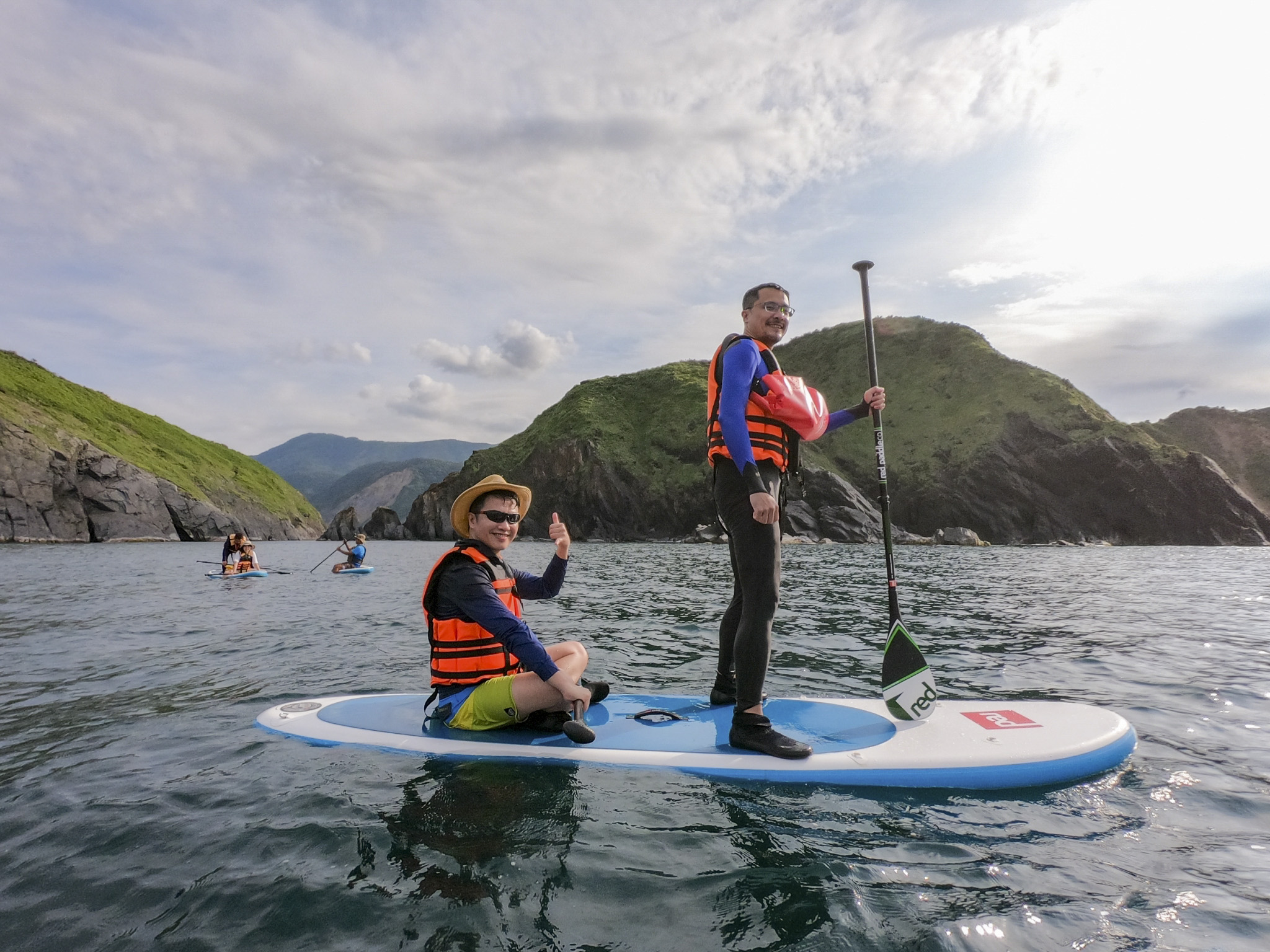 SUP 是 Stand Up Paddle 的縮寫,顧名思義就是要站著划槳,這可不簡單,特別是,若兩人一板,要克服的搖晃是兩倍程度,除了要有一定的平衡感,還需有良好默契。不過確實好玩,當坐在板上欣賞旁邊從海上冒出的鋒利島山,不由覺得:台灣,真美!