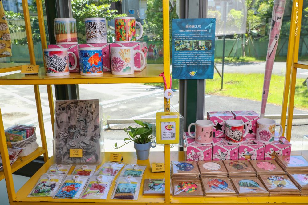 原以為這裡只是為了滿足粉絲而在幾米家鄉創立了全球唯一的幾米周邊商品店舖,沒想到,原來是要靠著幾米海內外的高人氣來作伙做公益!除了提撥銷售金額的 10% 給宜蘭縣政府社會處作為身心障礙者社會福利運用外,站內還無償提供場地與社福單位共同成立「米寶小作所」,讓數十位身心障礙者能在此學習並用己力創造收入,例如店內近期的明星商品:幾米幸福小象撲滿,即是「米寶小作所」成員們發揮創意共同創作的成果,就連包裝盒也是他們一個一個親手摺,而這些收入也都將回饋給他們。不光如此,站內除了販售品項齊全的幾米周邊商品外,也協助販售公益優採商品,如現在架上展示的宜蘭縣自閉症者福利協進會所製作的多款文創商品,更讓我感佩的是,站內有高達超過七成的服務夥伴,都是聘任身心障礙及弱勢民眾,可以想見這得要有多大心力,才能決定投入並堅持至今。