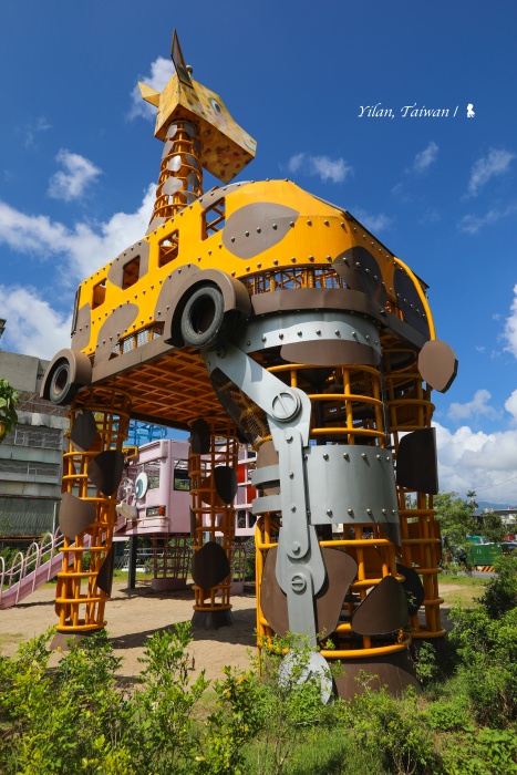 ⇑ 園區裡改造自巴士高達 11 公尺的長頸鹿,仔細看,有隻腳是義肢,希望藉此鼓勵殘障朋友,不完美也能活得很幸福,一樣能帶給世界許多美好