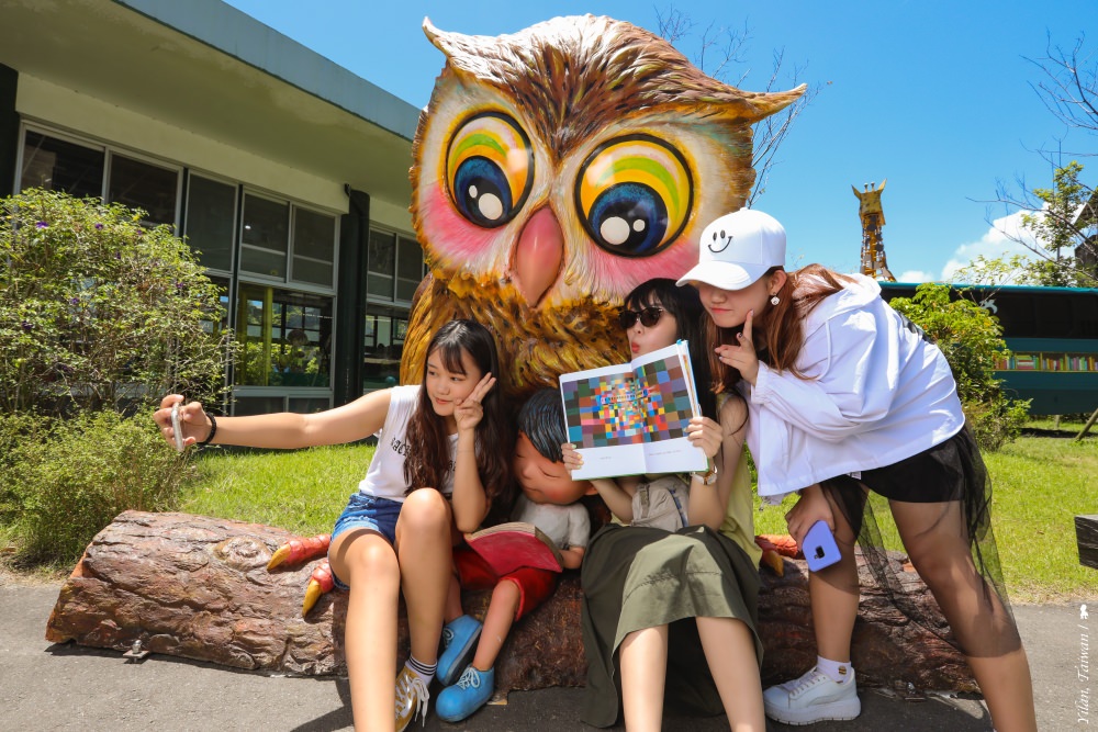 除了友善圖書巴士,這次還增加數個可愛的幾米雕塑並進行木棧平台的美化。有趣的是環抱整座建築的木棧道造型,竟是被工作人員暱稱為「幸福轉運站」大象站長的象鼻子,上頭有位身穿藍色上衣、正奔向轉運站入口的孩童玩偶,也成為小朋友喜愛的合照打卡點。緊鄰著,在小徑另一旁,小男孩正躺在貓頭鷹懷裡一塊舒服的翻書共讀,充滿童趣的同時也很點題帶出身後的圖書巴士。